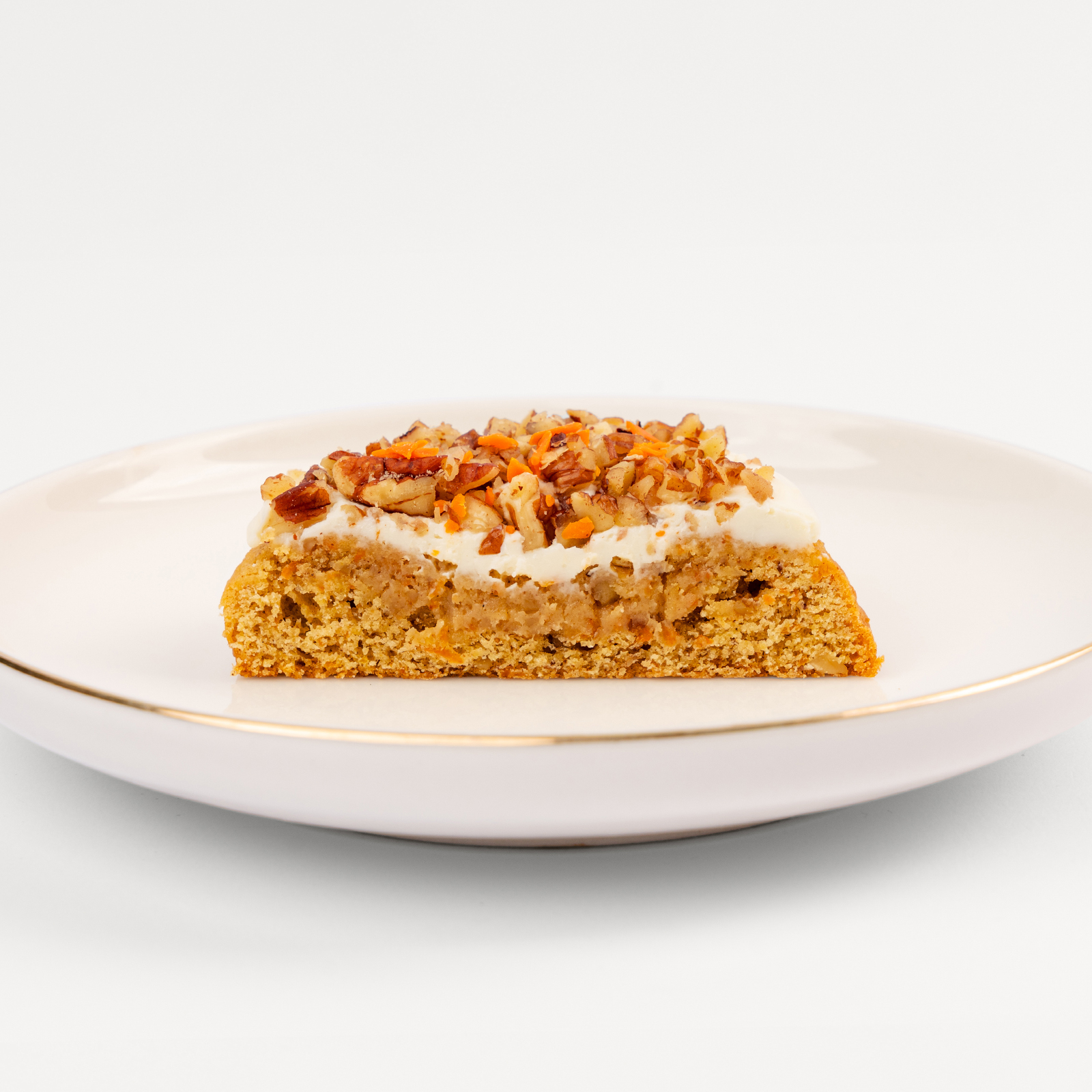 Bristol înseamnă: bază cu morcov și nuci, frosting de brânză cremos, nuci pecan crocante deasupra.