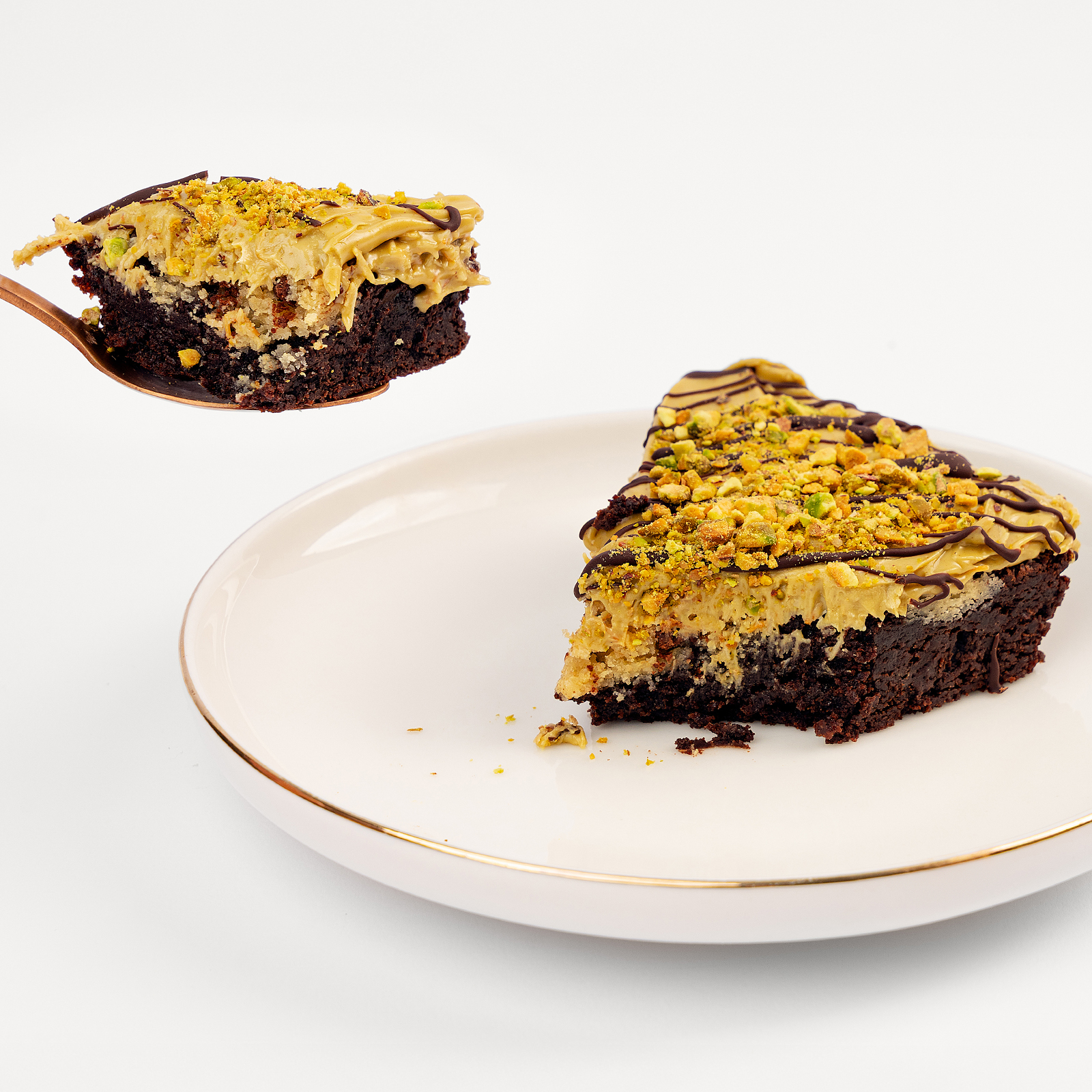 Brownie intens, aluat de cookie cu choc chips, un strat de kadayif crocant și cremă fină de fistic.